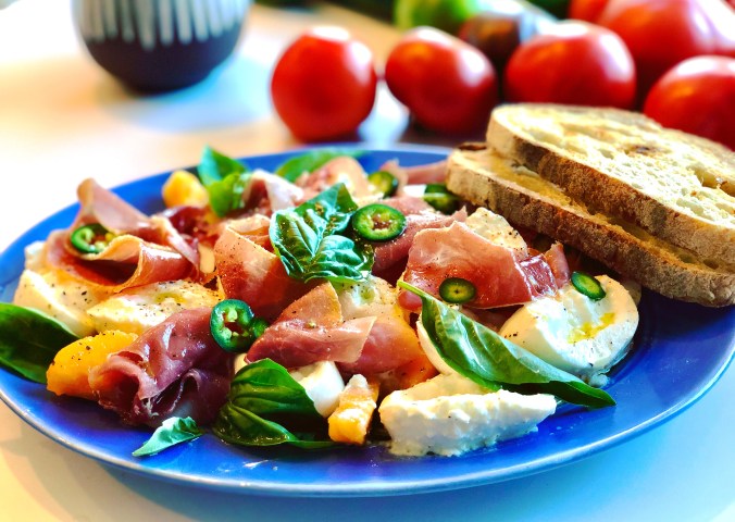 Peaches, burrata, prosciutto, basil, jalapeños, and evoo